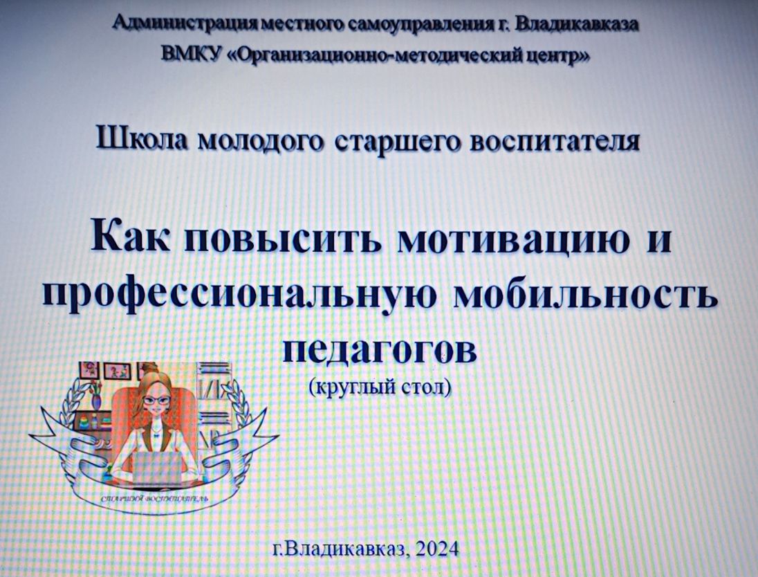 28 мая 2024 г. на базе МБОУ Д/С № 22 в рамках «Школы молодого старшего воспитателя» состоялось методическое мероприятие городского МО старших воспитателей муниципальных дошкольных образовательных организаций г. Владикавказа. Обсуждение за круглым столом проблемного вопроса «Как повысить мотивацию и профессиональную мобильность педагогов» было интересным и полезным для молодых, только начинающих свой педагогический путь, воспитателей.